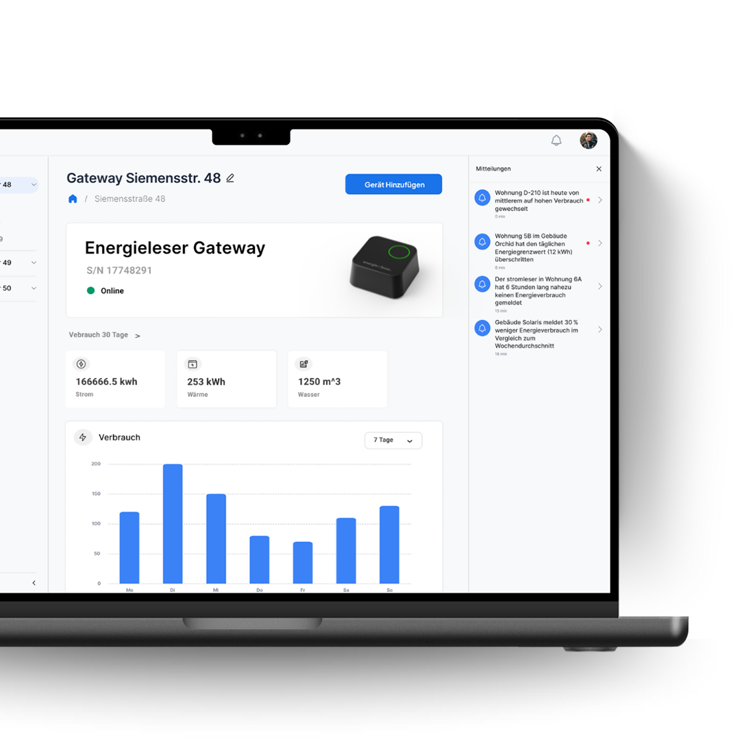 Das energieleser-Gateway (in Planung) ist das Herz des gesamten Systems: Strom-, Gas-, Wasser- und Wärmezähler/-leser funken direkt an die zentrale Einheit und schaffen so eine vollständige, klar strukturierte und sofort verfügbare Energieübersicht über jedes Gebäude.
