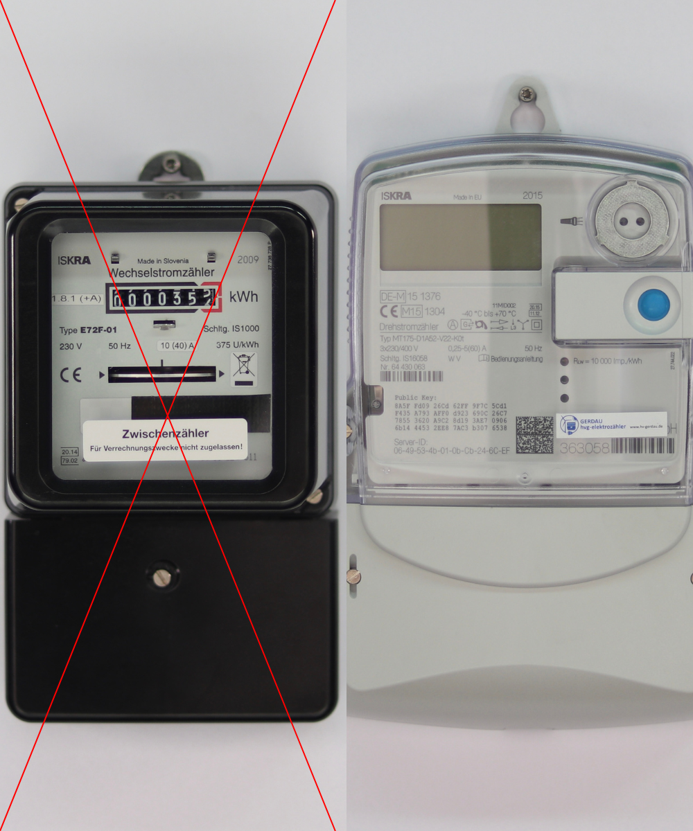 Auf der linken Seite siehst du einen Ferris-Stromzähler. Dieser ist jedoch kein Smart Meter, daher kann der Stromleser hier leider nicht verwendet werden. Auf der rechten Seite hingegen befindet sich ein Smart Meter, auf dem der Stromleser problemlos installiert werden kann. Der Stromleser ist auch mit vielen anderen Smart Metern kompatibel. Wichtig ist nur, dass dein Smart Meter über einen runden, magnetischen Bereich verfügt, auf dem der Stromleser aufgesetzt werden kann.