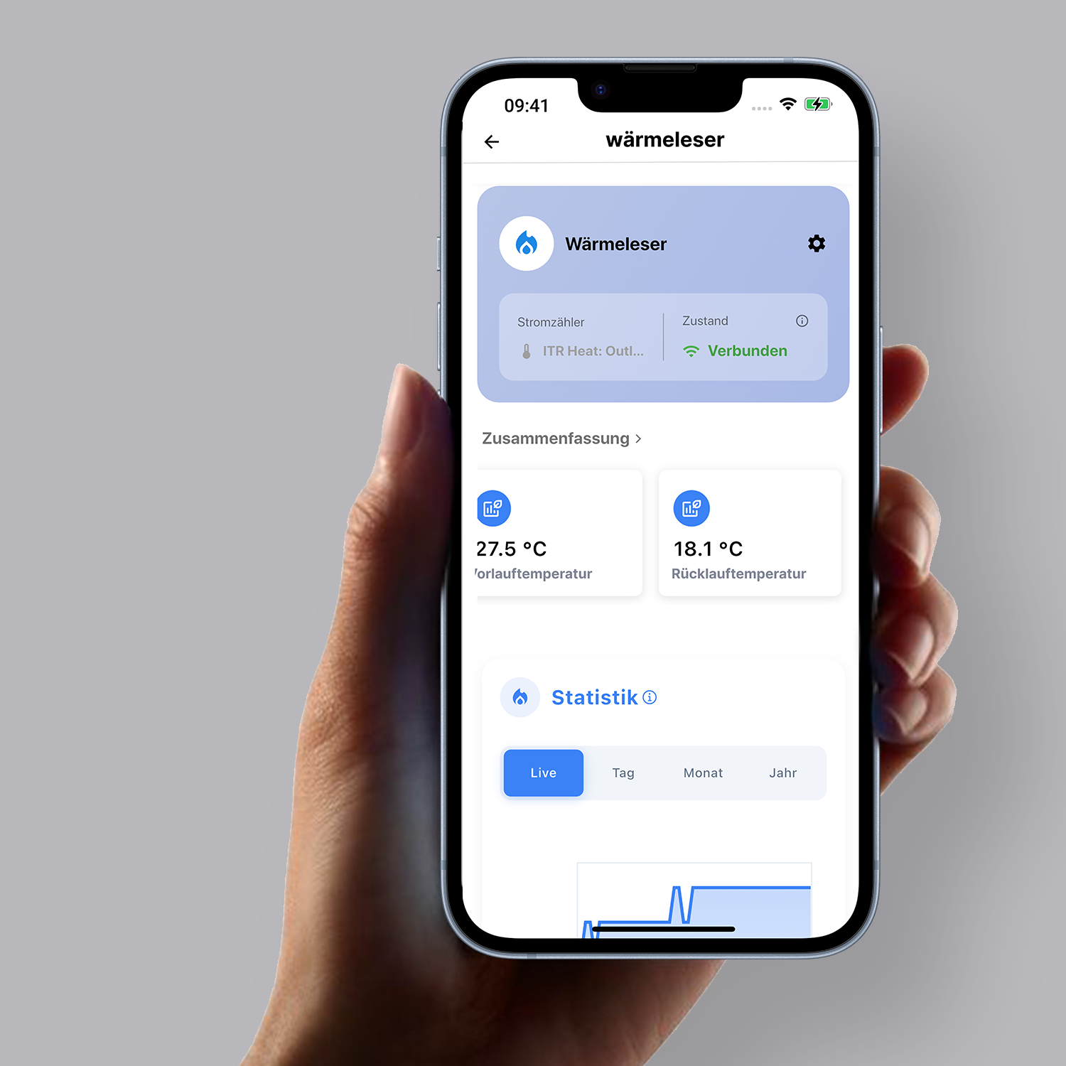 - Durchfluss, Vorlauf/Rücklauf-Temperatur & Wärmeleistung live mit Diagrammen in der App